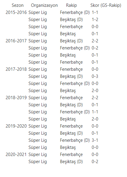 Galatasaray’ın ligde çıktığı son 22 derbi ve sonuçları şöyle: